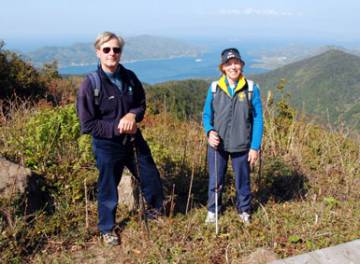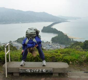 At the left Vicky is adopting the recommended position for viewing the sand spit, which is then supposed to resemble the ‘Floating Bridge of Heaven’. She wasn’t convinced. Spring