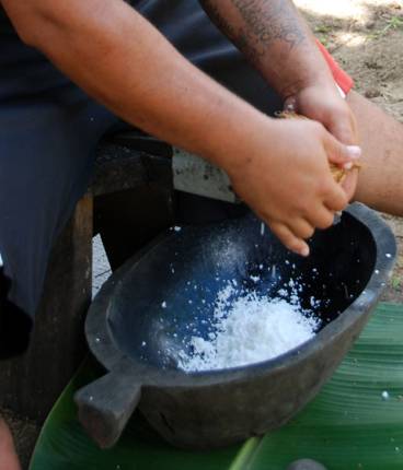 scraps of coconut meat from a split shell. The scraps were then placed on a