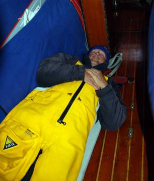 After a day of light sloppy beating we were soon into much heavier windward work, made even wetter by a very large southwesterly swell, which built until it was 6 – 10 metres. We were fortunate to have our Monitor windvane steerer, which took over much of the very strenuous business of steering. Nevertheless it was very tiring. During this first spell of strong winds we had our first minor damage when the 3rd reef pennant snapped. Fortunately it was possible to jury rig a replacement outside the boom. We also set our trysail for the very first time ‘in anger’, having only done so previously for practice. |