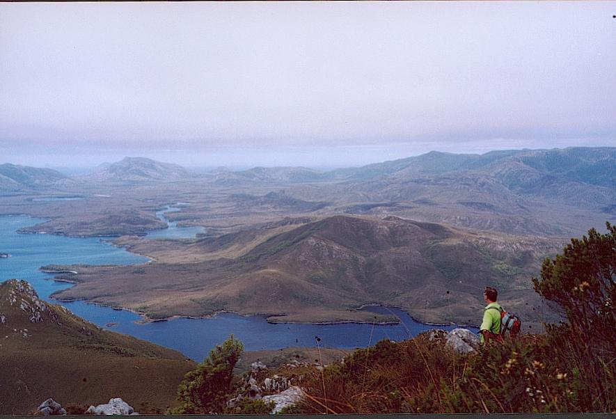 The entrance to Port Davey in misty dawn light is impressive even in calm weather as we saw it. In one of the westerly storms which frequent this coast, it must be truly frightening. Though there is a good clear entrance and a 'breaksea' island, the surrounding area is thoroughly rock strewn and the chart encouragingly notes large areas which are inadequately surveyed or not surveyed at all. All of this is backed by some good sized, craggy mountains, almost entirely devoid of trees. Even in calm weather a 2-3 metre swell rolls in from the SW. However, once past the entrance there is a well protected harbour with an excellent variety of anchorages. For a relatively remote area, Port Davey is quite a popular cruising area, and we were lucky to have it mostly ourselves, while others recovered from the 'Wooden Boat Festival' held in Hobart. Wombat and Casilda Coves, North Inlet and Eve Point were all pleasant anchorages, though the holding was often little more than very thin mud over rock. The area also experiences the stronger aspects of SE Australia's 'southerly changes', so that we tended to sleep lightly and spent a pre-dawn hour setting a second anchor in Wombat Cove. Tom split open a toe during the latter exercise, which proved a blessing in disguise as it provided an excuse to avoid joining Vicky and the crew of 'Gundy Grey' in climbing Mt. Rugby. |
