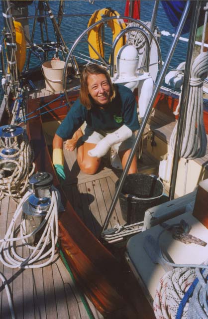 Unable to resist the temptation to go racing we went out on a new friend's Ross 930, a light-weight one-design with minimal fittings and winches. During a practice spin take-down, Vicky was determined to ease rather than run the guy. Unfortunately it had other ideas and only stopped moving when Vicky's hand was pulled to and part way into the turning block. Normally the air turns blue when this kind of thing happens, but it was clear in this case from the silence that things were not quite right. So it proved when an xray showed two cracked metacarpals in her left hand. The addition of a cast eliminated any temptation for two-handed work and for Tom had the unusual advantage of making him indispensible - at least for important matters like shoe lace tying and meat cutting. As we had already revised our likely departure to early March, the initial prognosis of 3-4 weeks for recovery seemed to fit in fairly well. In the event this was optimistic, with 5-6 weeks being more realistic. |