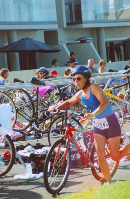 In the midst of all this work Vicky could not resist the temptation to indulgence. She had seen adverts for a women's sprint triathlon locally. Since we had been biking everywhere since our arrival she was in good training for the cycling element of 10 km. The running was not new to her, and at 2.5 km little more than a sprint. However, the swimming, even at only 400 metres was a challenge. A month of training brought her to peak fitness, though 'freestyle' would be a generous description of her mixture of swimming strokes. Nevertheless, they proved effective. Supported by a team of trainers, fans and paparazzi, she made her successful debut, with a very respectable time of 45 minutes and 20th place out of about 80 in her age group. |