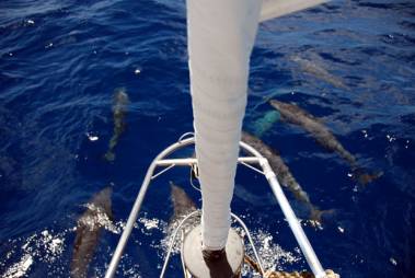 hook and friendly pods of dolphins frolicking in the pressure wave under our
