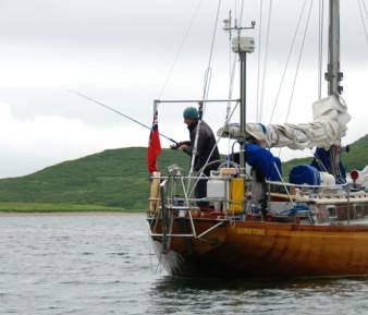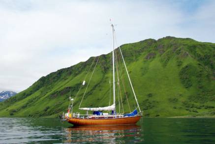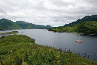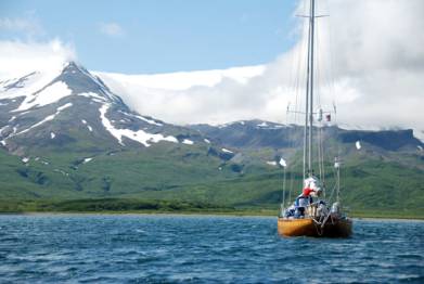 At Sand Point we were faced with a decision. The time available for further cruising in Alaska was running out. We felt that either we could head further up the Alaska Peninsula to Hidden and Geographic Coves or make a jump to Kodiak Island, which is a wonderful cruising area in itself. The latter option won and we made an overnight passage to the appropriately named Japanese Bay. This is a completely land-locked anchorage approached through a narrow but deep channel. The high land around it and the snow-capped mountains further inland made it very attractive. The next day we indulged in a short and gentle motor