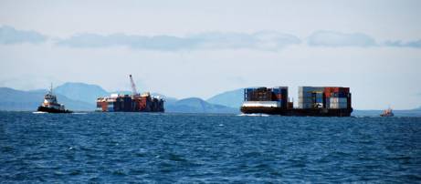 huge barges under tow far behind big, powerful tugs. Sand Point is a very