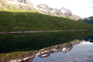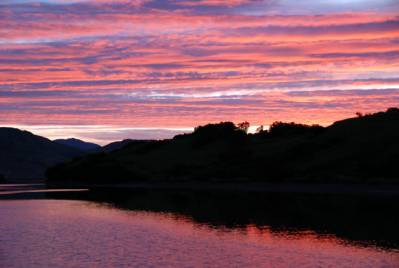 In continuing delightful weather we headed further north for our last stop before Kodiak Town. Though Shearwater Bay is large and somewhat exposed to the southwest, there is an anchorage in a small, virtually land-locked cove in the southeast corner of the bay. The entrance to the cove is narrow, but deep and the pool inside was exactly ‘Sunstone’-sized. It was the perfect spot to view a typical Alaskan summer sunset – at about 2230 at night. |