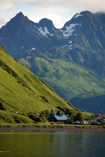 with its blue-roofed and onion-domed Russian Orthodox church, is dwarfed by