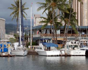 Boat Harbor in Honolulu, under the towering Waikiki hotels. |