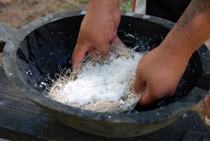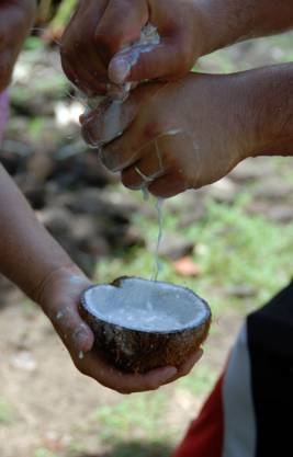 scraps of coconut meat from a split shell. The scraps were then placed on a