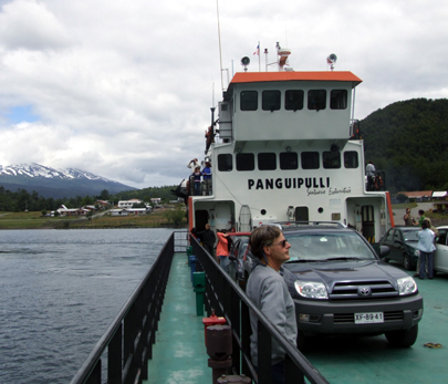 From Villarrica we drove through beautiful farming country in unaccustomed sunshine, past sparkling lakes, lush pastures and even lusher green woodland to Ian and Maggy Staples Farm near Los Lagos, for a further Ocean Cruising Club gathering with Mike and Cath also in attendance. Here, Vicky got a rare opportunity to go riding and we caught up on the progress of Ian and Maggy's honey project. By this time Vicky was also champing at the bit, but in this case for a proper hike, so we set off on the trail to the Three Lakes in the National Park near Pucon. We just about managed to reach the height of all three before our weary legs demanded a return to lower levels. This being an insufficient adventure, Vicky then navigated us via a succession of 'black' roads toward the ferry on Lago Panguipulli. Goats might have been happy to call these roads, but our small red car was at times on the verge of giving up the unequal struggle. However, neither boulders nor knee-deep pools could keep us from making the only ferry which would allow us to cross the border back into Argentina before nightfall. If you think the exotic cruising can be challenging, try taking a land-tour with Vicky in the navigators seat! |
