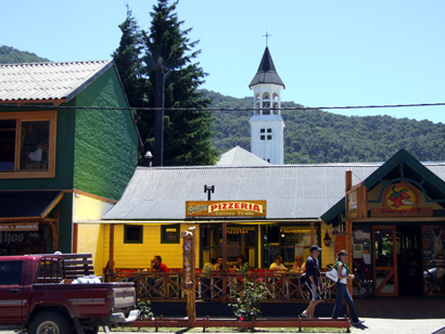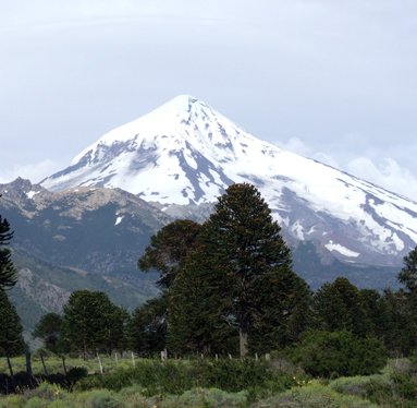 At San Martin we hired a small, very red car, which fortunately boasted a large engine, for whose every horse we were grateful during the more demanding parts of our travels during the following week. We headed first across the Andes into Chile across the Tromen pass in the shadow of Volcan Lanin. Almost simultaneously with our passing through the two border posts, we moved from the warm sunshine of Argentina into the cool drizzle of Chile, perfectly duplicating all but two of our January days of the previous year in the Canales. We made up in conviviality that evening what the weather lacked in warmth, staying with Wolfgang and Gaby at their farm in Villarrica, where we also met up with our cruising friends Mike and Cath from 'Breila' and Dario and Sabina of 'Pachamama' with new small crew member Serena. |