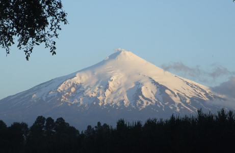 Beautiful Volcan Villarrica, glowing in evening light, with a wisp of smoke rising from its vent |